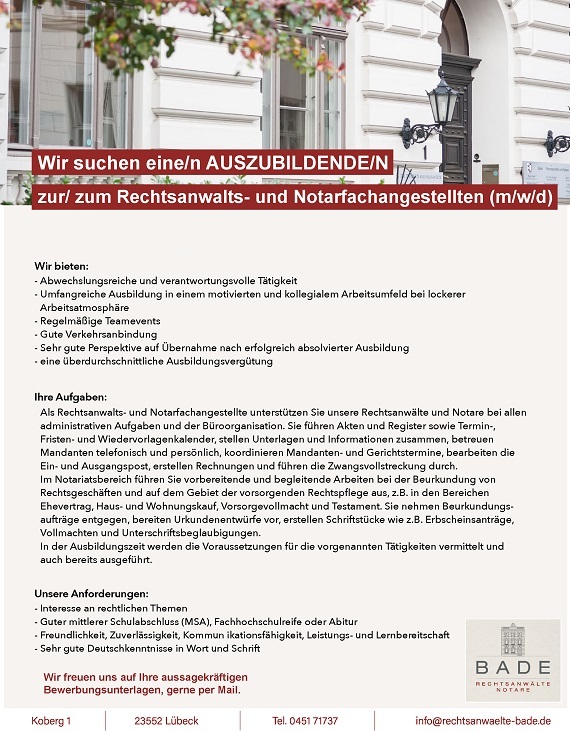 BADE Rechtsanwälte und Notare Koberg 1 23552 Lübeck Tel.: 0451 71737 Fax: 0451 71963 info@rechtsanwaelte-bade.de Impressum Datenschutz